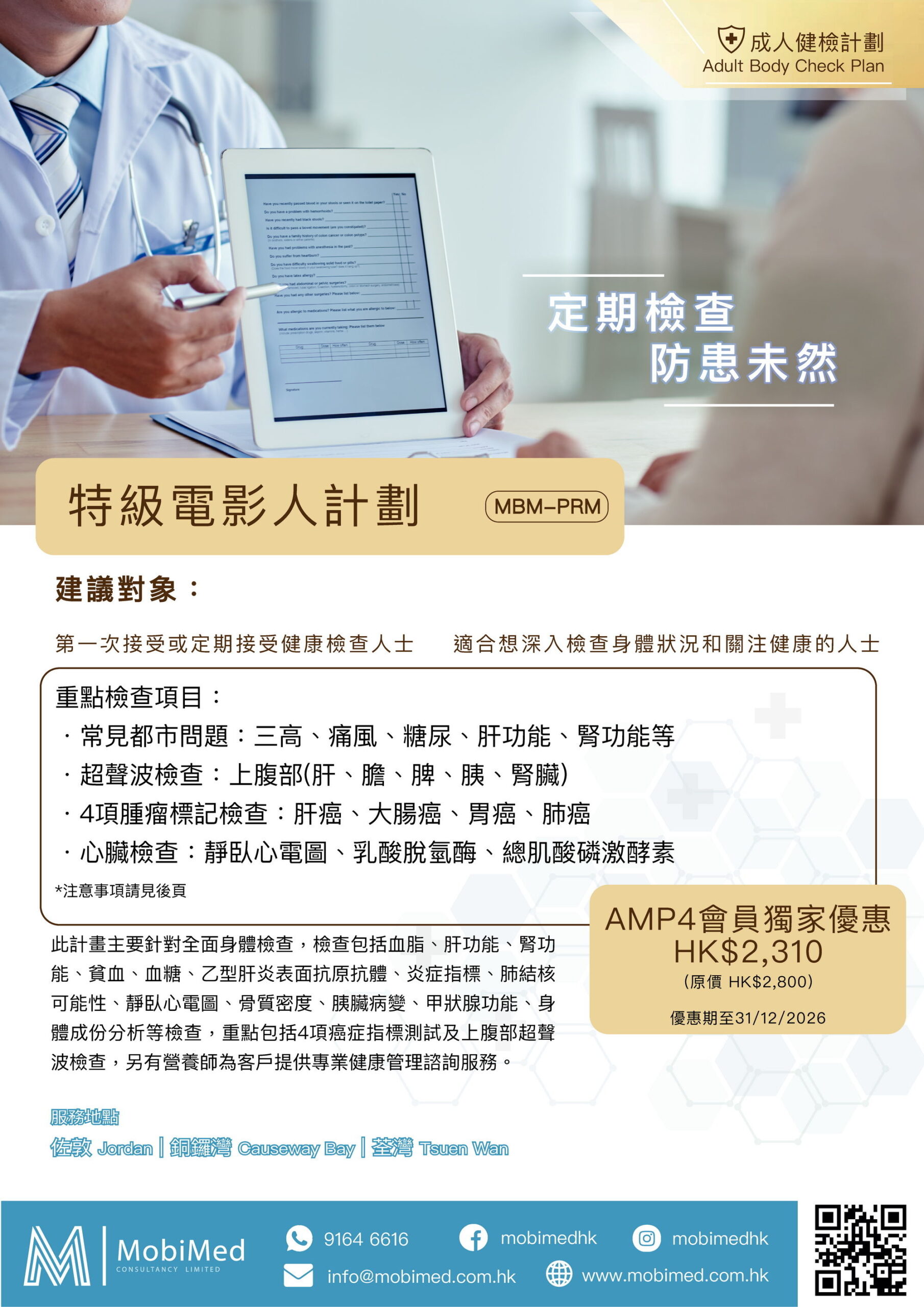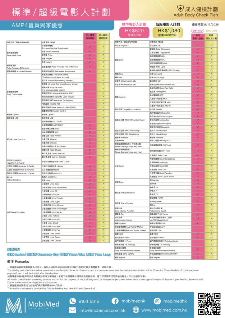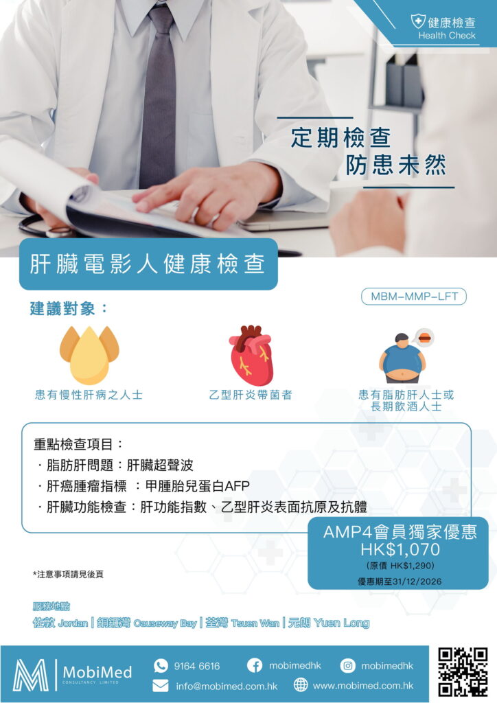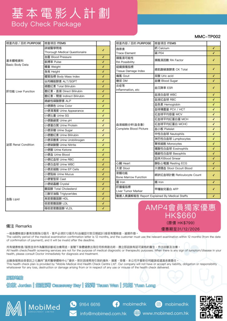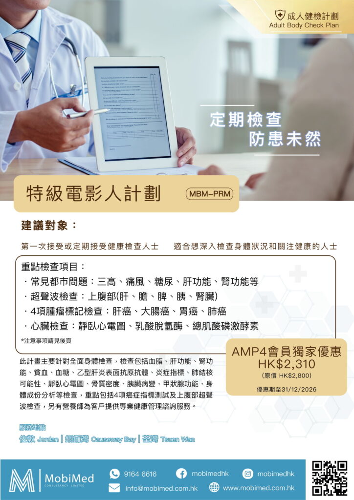 AMP4會員、家屬及親友,出示有效AMP4會員證或會員證截圖,可獲75折(25% off)優惠。會員若有任何其他的檢查項目需要的話,也可以直接在電話裡跟接待員查詢報價,同樣享有折扣優惠。預約WhatsApp:9164 6616。